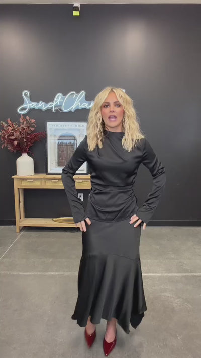 A skirt that moves like poetry. The Dark Romance Midi Skirt is crafted from a soft satin blend that drapes beautifully with every step. Designed with an elastic waist for comfort and ease, this flowy silhouette pairs seamlessly with our Dark Romance Ruched Top for the ultimate evening ensemble.
