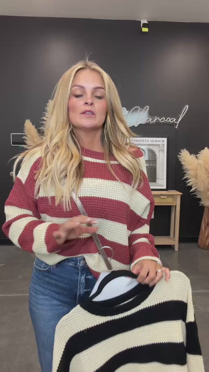 This is the sweater you’ll reach for over and over again. Made from the softest knit (like, cloud-level soft), it features a classic round neckline, long sleeves, and a relaxed fit that gives it that easy, laid-back vibe. The stripes keep it timeless while the loose silhouette makes it perfect for layering over a collared shirt or pairing with your favorite denim. It’s cozy, comfy, and cute—basically, your fall uniform. Comes in 2 colors.