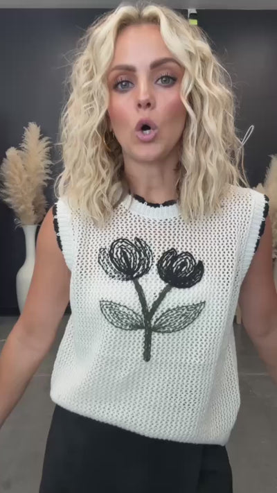 - Boho tulip embroidery contrast trim crochet sweater vest top.