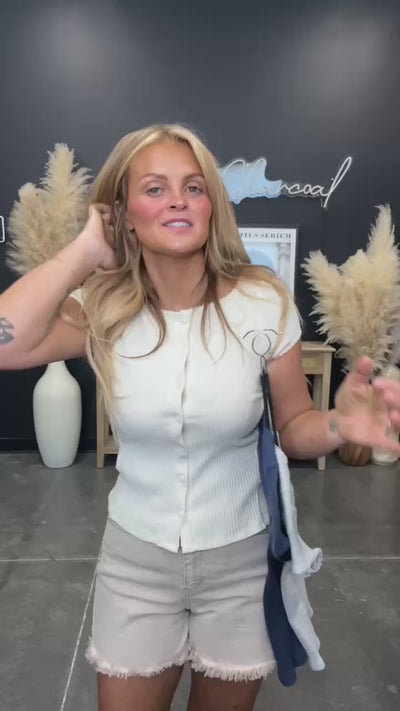 Cute and classic, this shrunken cardi is featured in a hugging ribbed fabrication with short capped sleeves and buttons all the way up the front.