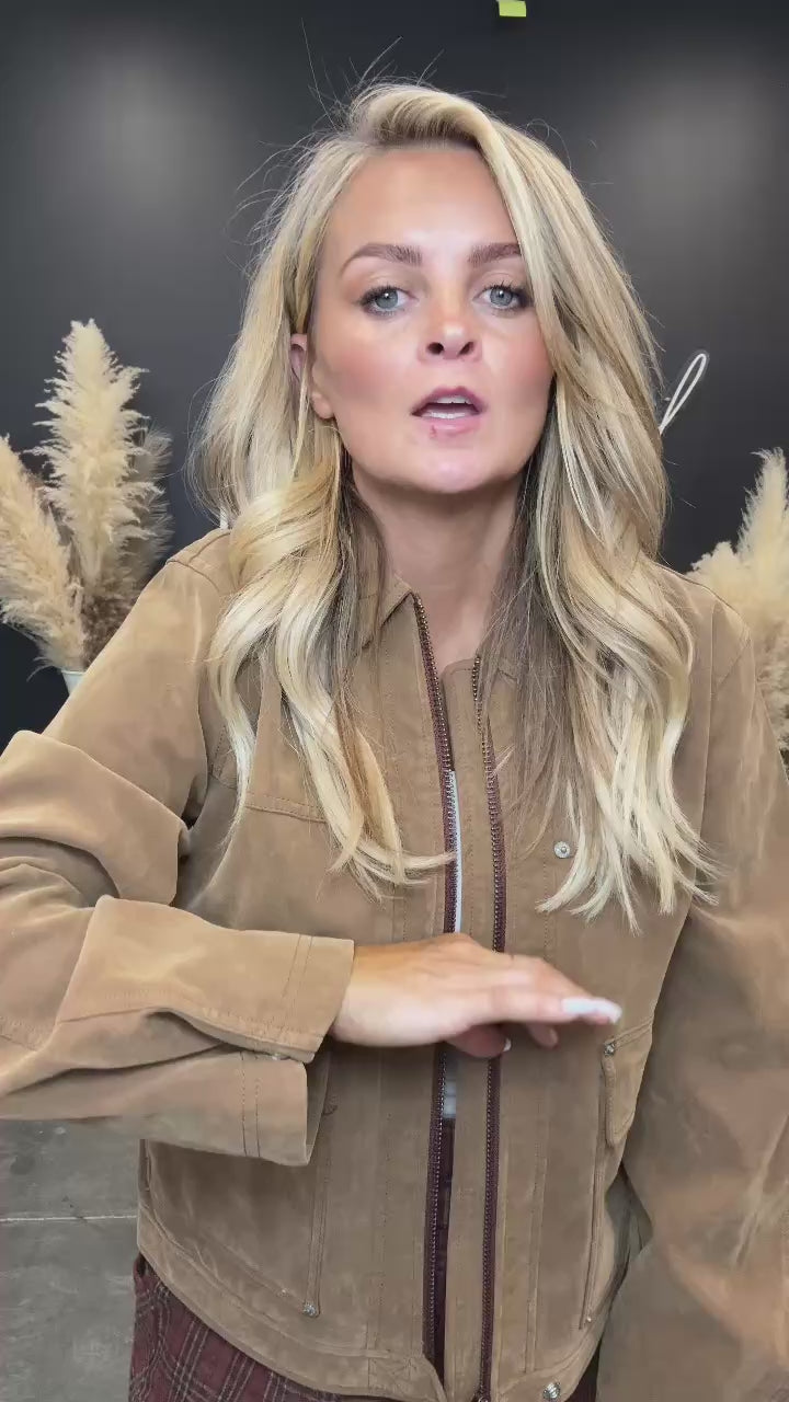 Features: Vegan suede fabrication, collared neckline, zipper closure, yoke seam, snap details throughout, flap pockets, bell sleeves