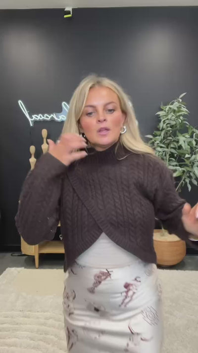 - Long sleeve turtleneck sweater with solid cable knit pattern.