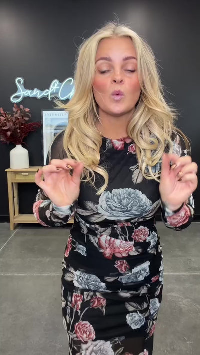 Romantic meets modern in this dreamy floral maxi. With its soft sheer overlay, subtle ruching, and elegant boat neckline, it’s the kind of dress that feels both timeless and unexpected. The semi-sheer sleeves and partial lining create the perfect balance between covered and captivating — effortless for dinner dates, parties, or any moment that calls for quiet drama.