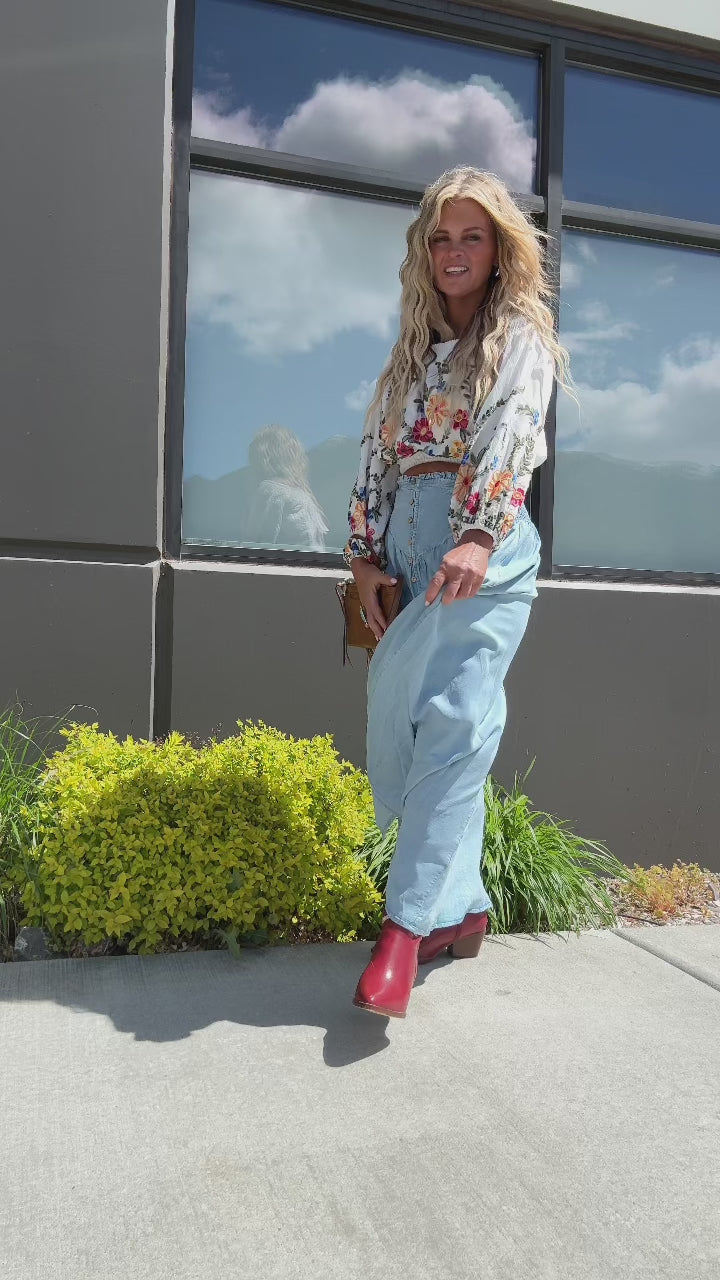 True to size with a stretchy smocked neckline and waist. Designed to sit cropped with a relaxed, billowy sleeve.