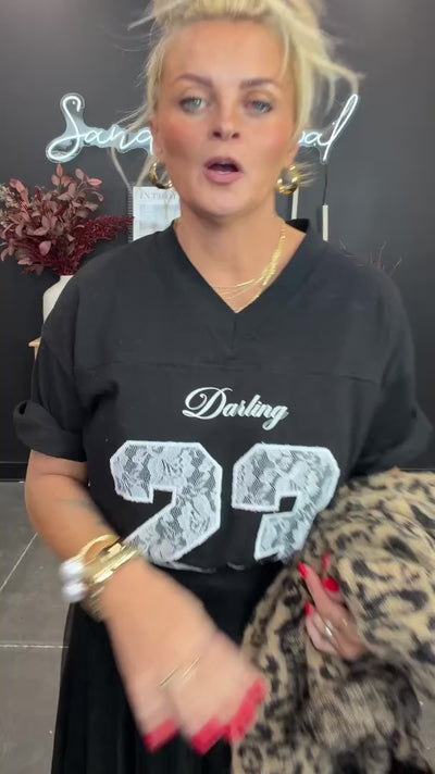This is not your average jersey tee. The Darling 23 Lace Embroidered Heavy Cotton Jersey blends classic athletic energy with a romantic edge, featuring a bold lace-embroidered “23” that instantly sets it apart. Made from heavyweight cotton jersey, it has that structured, premium feel you love while still wearing easy and comfortable.