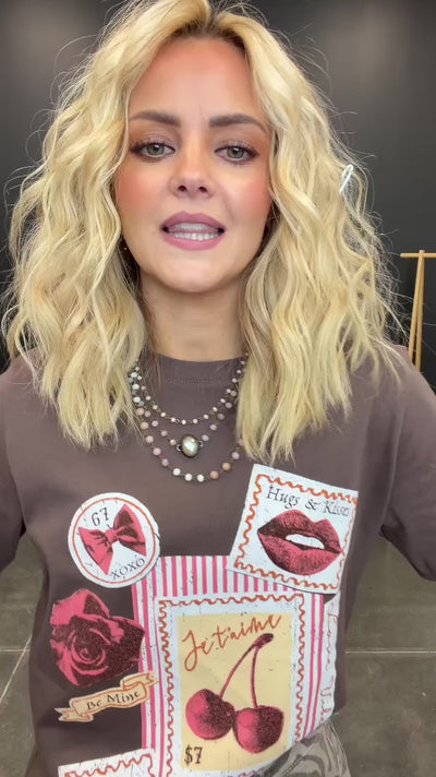 Vintage Valentine vibes, but make it fashion. This boxy crew neck tee features an adorable collage of stamp-style graphics—think cherries, lips, roses, and love notes—giving it that nostalgic, collectible feel. The best part? The contrast lace sleeves built in for an effortless layered look, so you get all the outfit credit with none of the extra work.