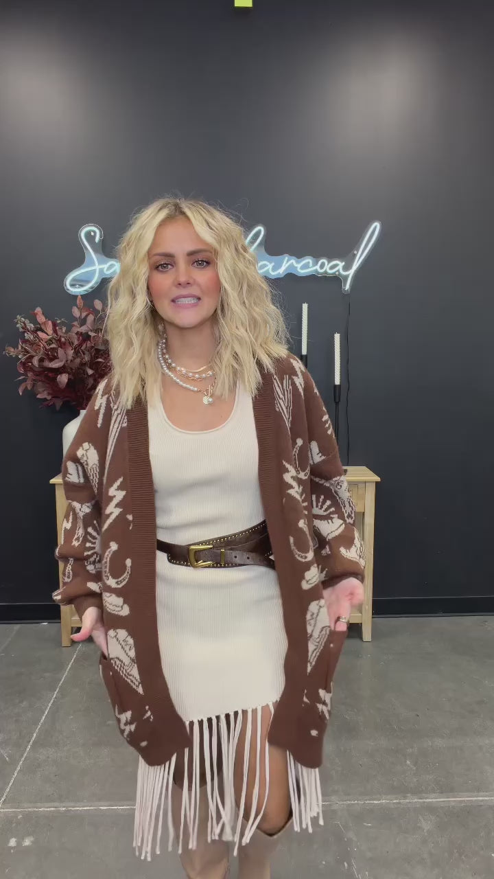Wrap yourself in all the western charm with this ultra-soft knit cardigan. This cardigan brings the perfect mix of cozy comfort and bold graphic details: suns, horseshoes, cacti, lightning bolts — all woven into a warm, rich brown base. It’s relaxed, drapey, and effortlessly cool… the kind of layer that instantly turns a simple outfit into a full moment.