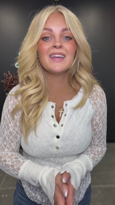 Bring a touch of romance to your everyday style with this sheer lace henley top, designed to elevate even your simplest denim days. The delicate lace texture adds a dreamy, feminine feel, while the slim-fit silhouette flatters your shape without sacrificing comfort. Finished with a classic henley neckline and lightweight long sleeves, it’s that effortless mix of pretty + polished you’ll reach for again and again. Available in black and white.