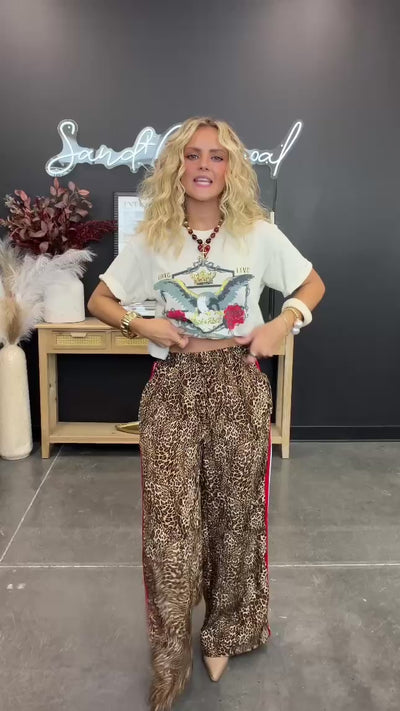 These leopard print trousers bring instant edge with a relaxed, wide-leg silhouette and bold red contrast side panels. Designed with a comfortable elastic waistband and lightweight drape, they move effortlessly while making a statement. The sporty stripe detail adds a modern, street-style feel that balances perfectly with the timeless leopard print. Easy to dress up or down, these are the pants that do all the talking.