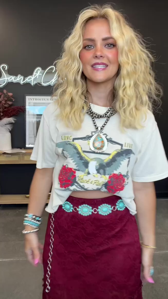 This deep red lace skirt is made for movement—lightweight with a dreamy drape that catches every breeze. The rich color and delicate lace detailing bring that perfect mix of western charm and feminine edge, making it just as stunning for a night out as it is for a daytime moment. Pair it with denim, boots, or a graphic tee and you’ve got a look that feels effortlessly put together.