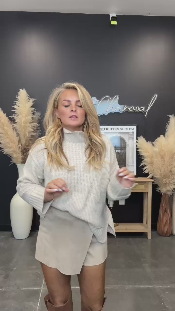 This khaki mock-neck pullover is the sweater you reach for when you want effortless polish with zero fuss. The mock neckline and rib knit give structure, while drop shoulders and extended cuffs keep the silhouette relaxed and lived-in. A subtle split hem adds movement and modern detail, so it pairs perfectly with wide-leg pants, fitted denim, or your favorite skirt. Neutral, soft, and endlessly wearable — basically your new go-to.