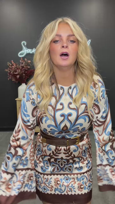 Make an entrance without even trying in this beautifully detailed tapestry-style dress. Bold blue and warm brown tones create an eye-catching pattern that feels both vintage-inspired and Western chic. The flowy bell sleeves add movement and drama, while the mini length keeps the look fresh and modern. Soft, lightweight fabric makes it perfect for year-round styling — pair it with tall boots for fall or sandals in the warmer seasons.