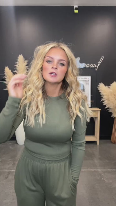 Meet the top that goes with literally everything—but looks even better with its matching pants This olive long sleeve crop features a soft, stretchy feel with a classic round neckline and just-right length that hits at the waistline. It’s comfy, flattering, and easy to style whether you’re lounging, layering, or heading out the door. Pair it with the matching pants “Sunday Slowdown Pants” for the full set moment or mix it with your favorite denim for an everyday look that still feels pulled together.