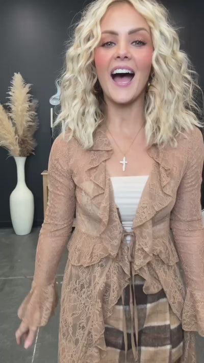 A longline duster that reads like a memory, Tenderly Late drapes in sheer floral lace with cascading ruffles, flared cuffs, and a softly scalloped mid-calf hem. The adjustable front tie lets you wear it open for drama or tied for an intimate, waist-cinched silhouette—either way it feels like a wistful, romantic moment you can wear.